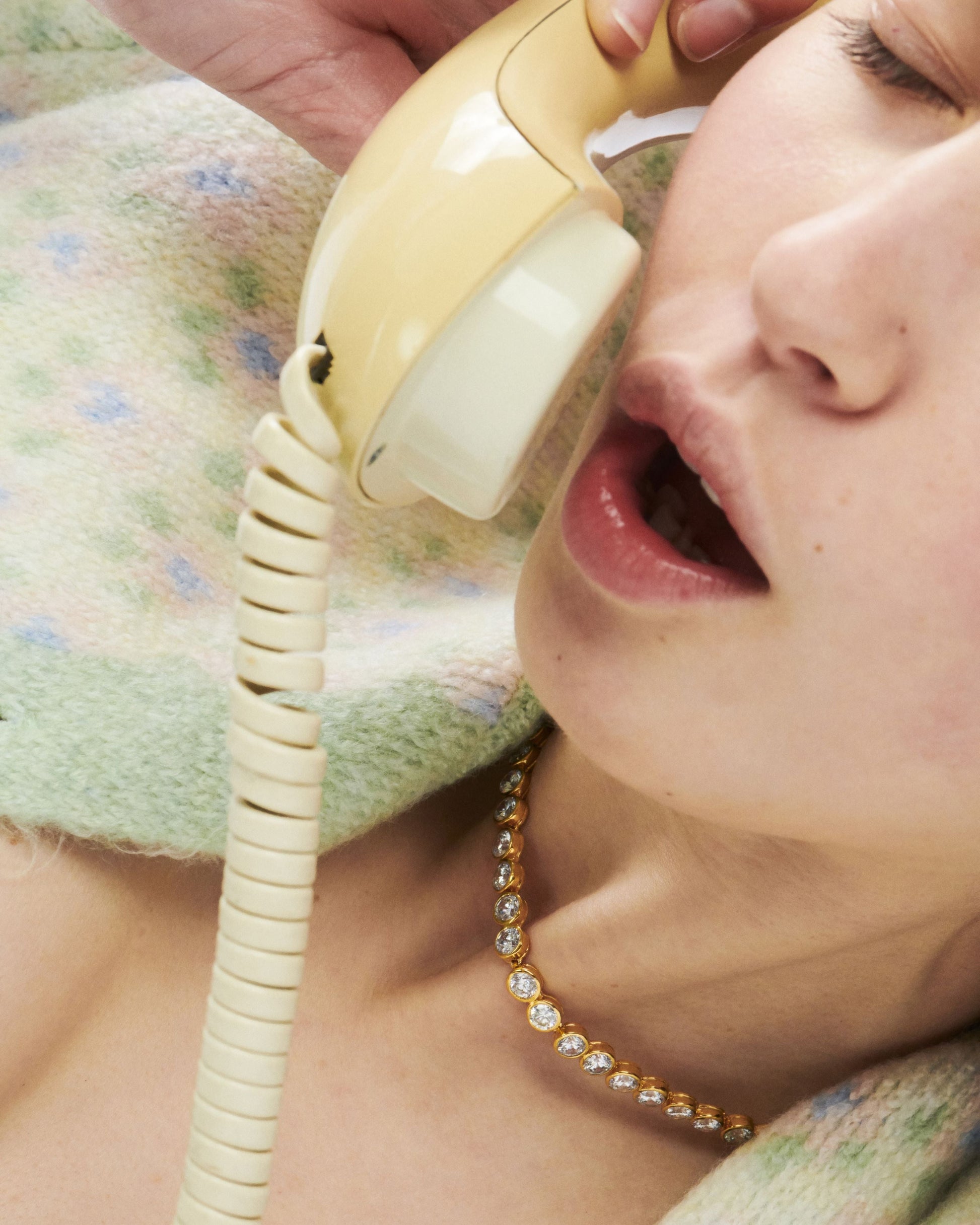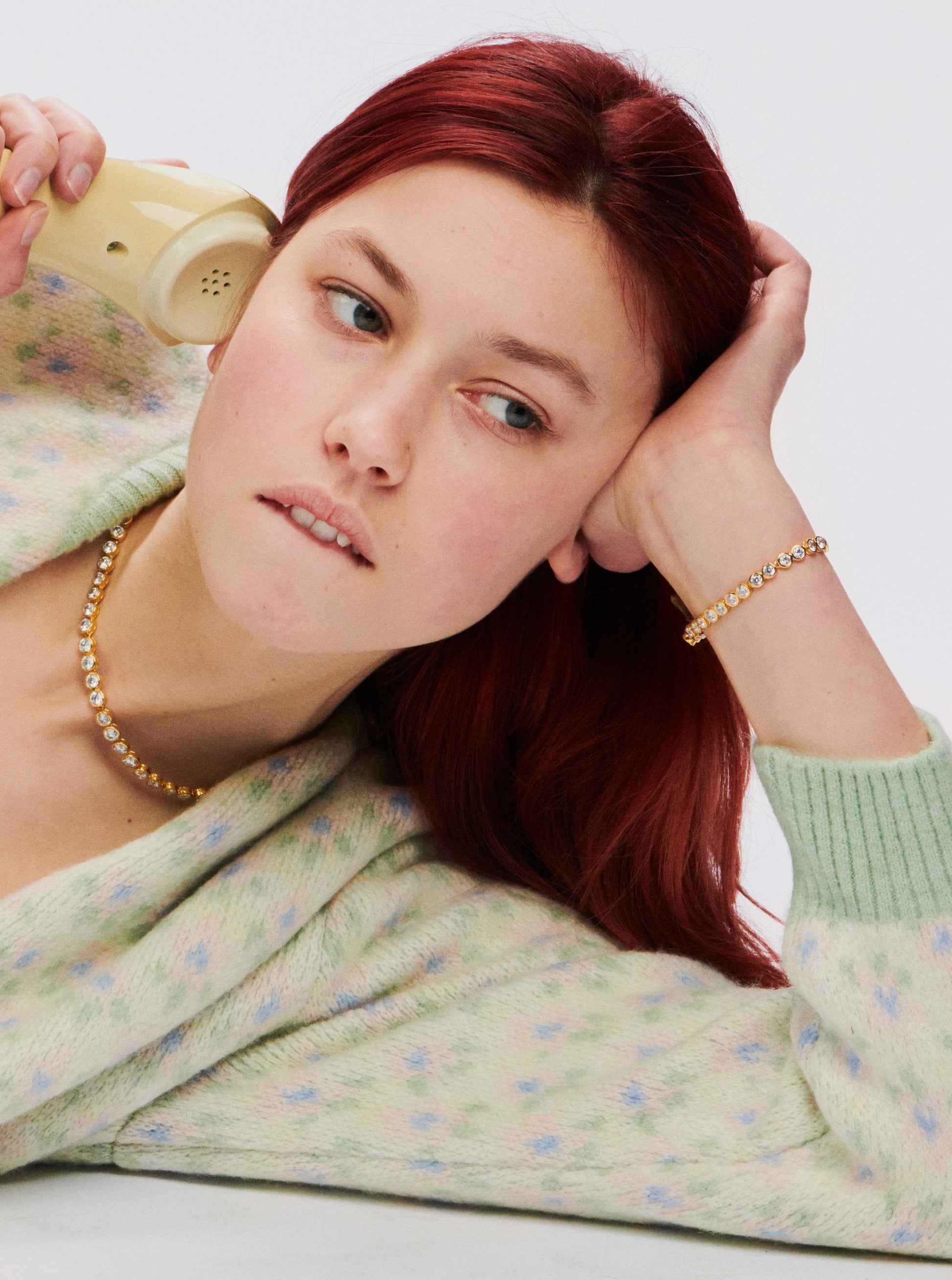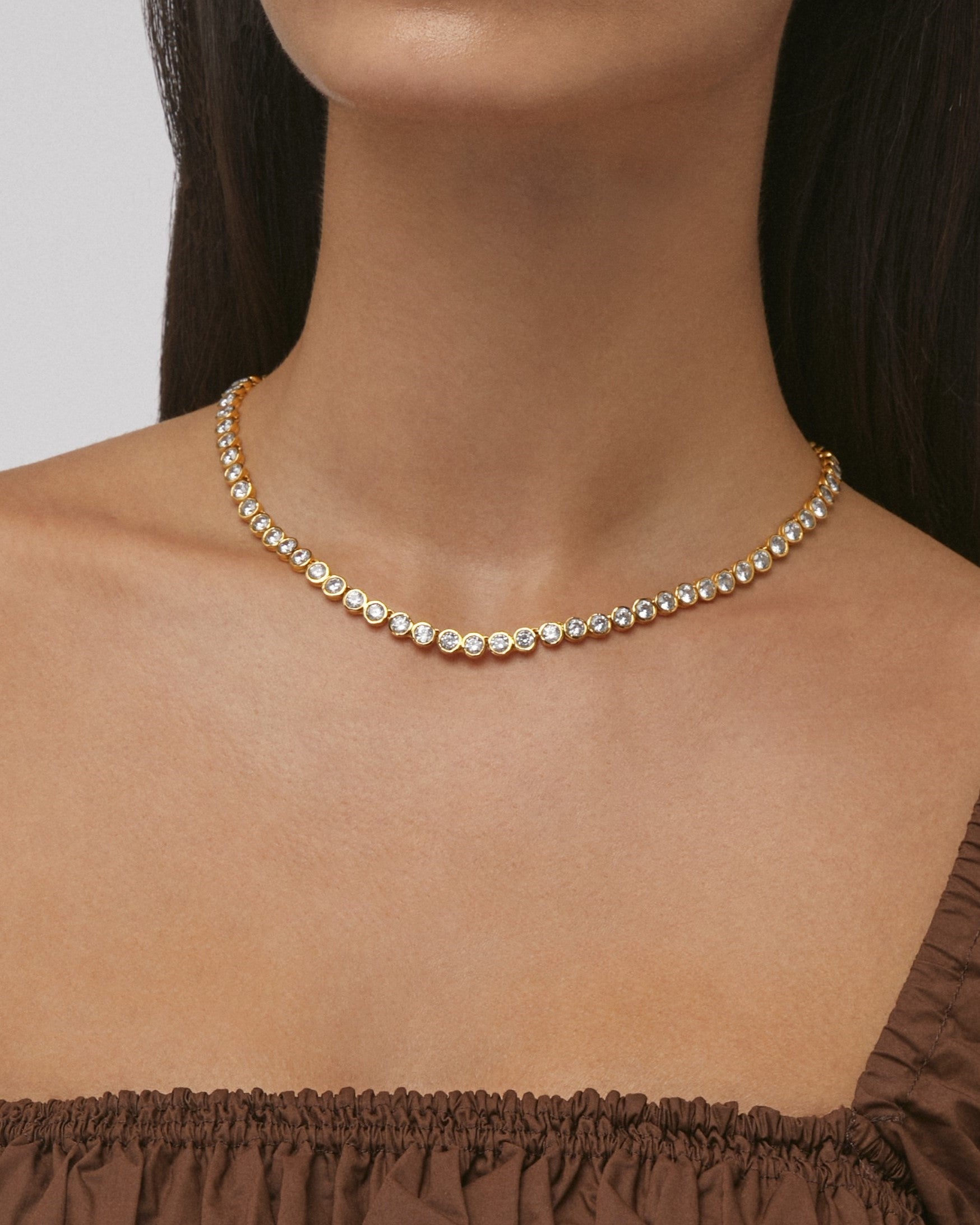 Our bestselling Chris Tennis Necklace is plated with 18ct gold and set with cubic zirconia, this is an unmissable piece that glitters with every move you make. And at 39cm long, it’s the perfect choker-length—let it fly solo or layer. LIMITED STOCK.